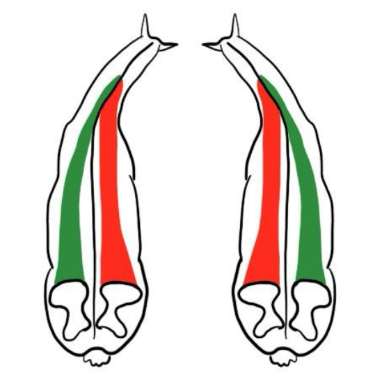 Bij veel paarden zie je dat het achterbeen aan de lange, slappere, bolle kant van het lichaam minder ver onder de massa komt. Bij een linksgebogen paard is dat vaak het rechterachterbeen.