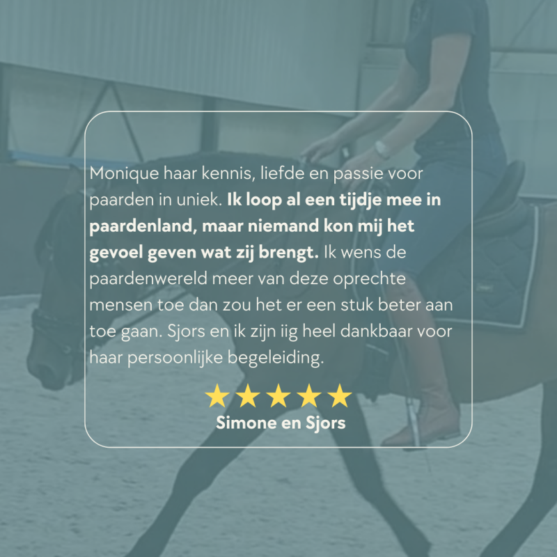 Dankzij de lessen van Monique heb ik geleerd Orion te accepteren zoals hij is. Door zijn grote, lange lijf heeft hij moeite met buiging en leunde hij graag op mijn hand – iets wat ik jarenlang onbewust versterkte. Nu leer ik hem op zijn eigen benen te lopen, zonder vast te pakken. Hij beweegt losser, onze samenwerking is lichter en we genieten allebei veel meer van het rijden!
